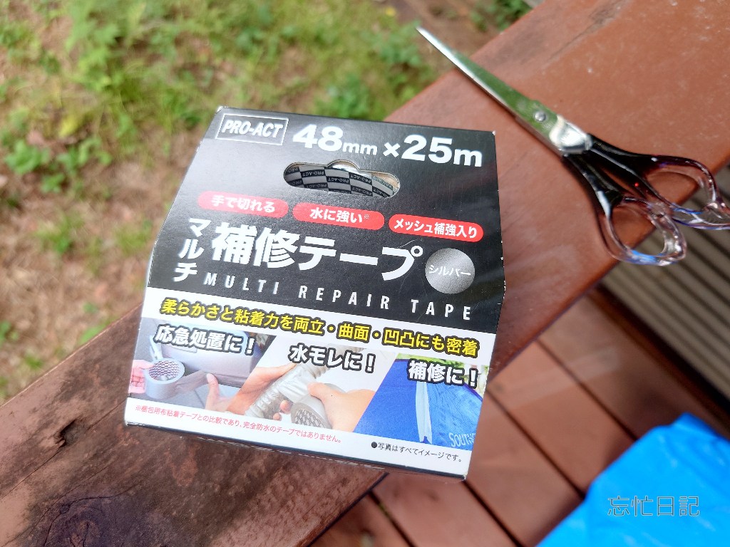PRO-ACTマルチ補修テープ48mmというものです。コーナンのオリジナル製品です。水にも強く使用例にブルーシート補強の写真もあるので、くっつくに違いありません。長さも25mあれば十分足りそうです。