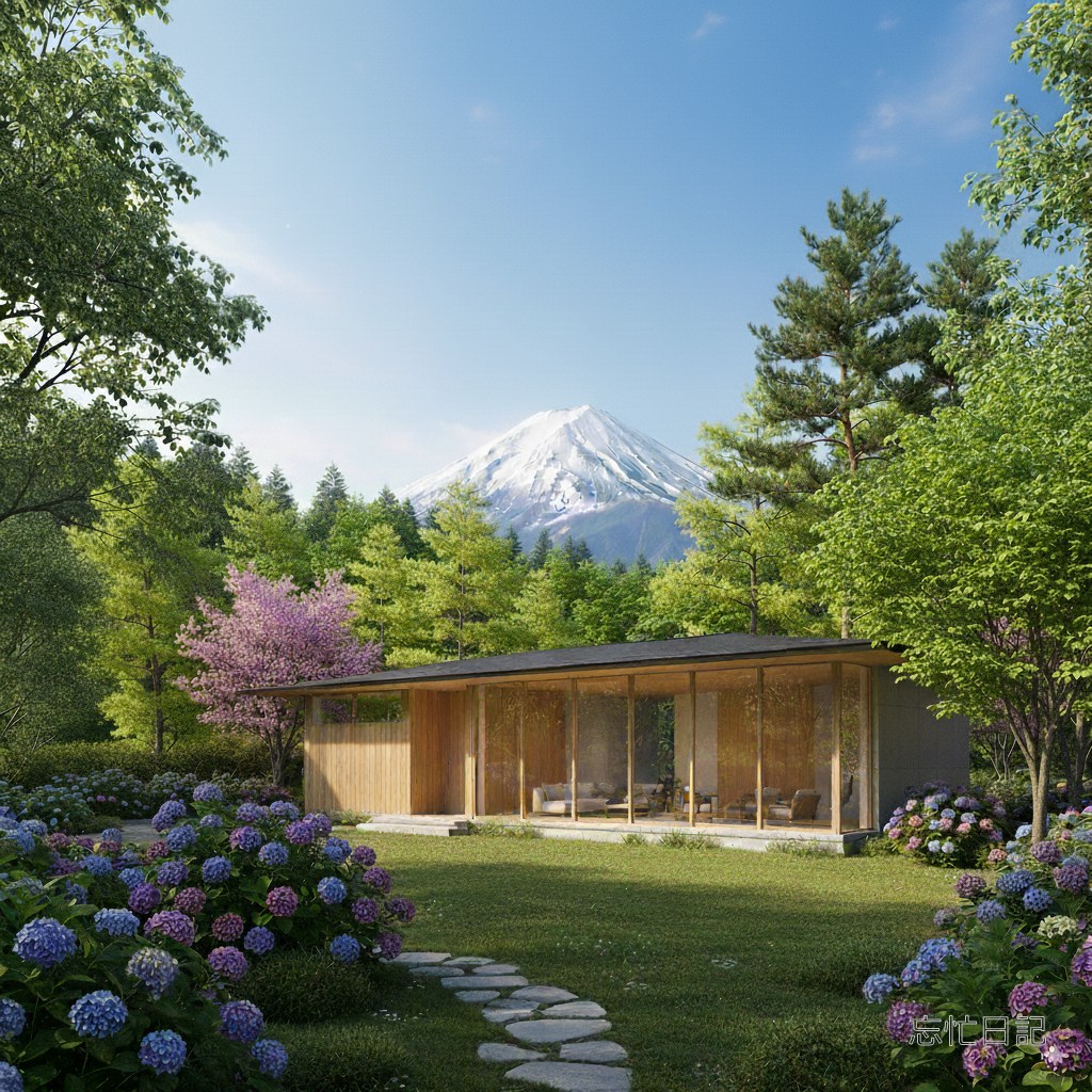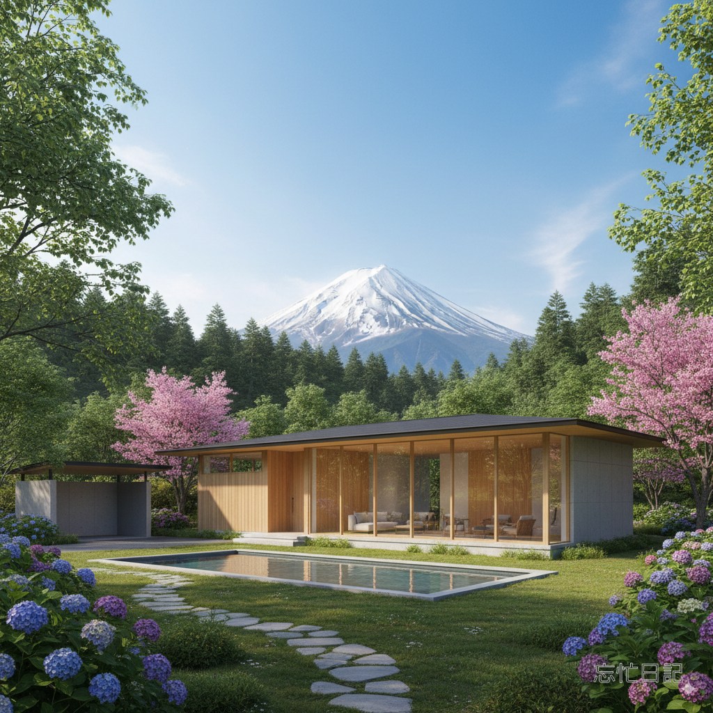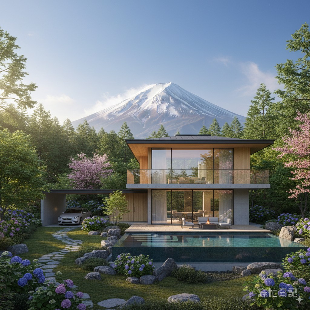 初夏の日本の富士山麓の高原にある、コンパクトでモダンな別荘のリアルなイメージを作成してください |