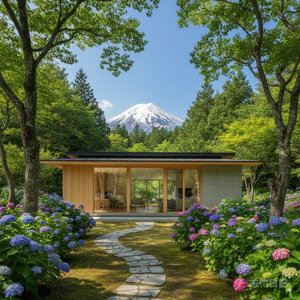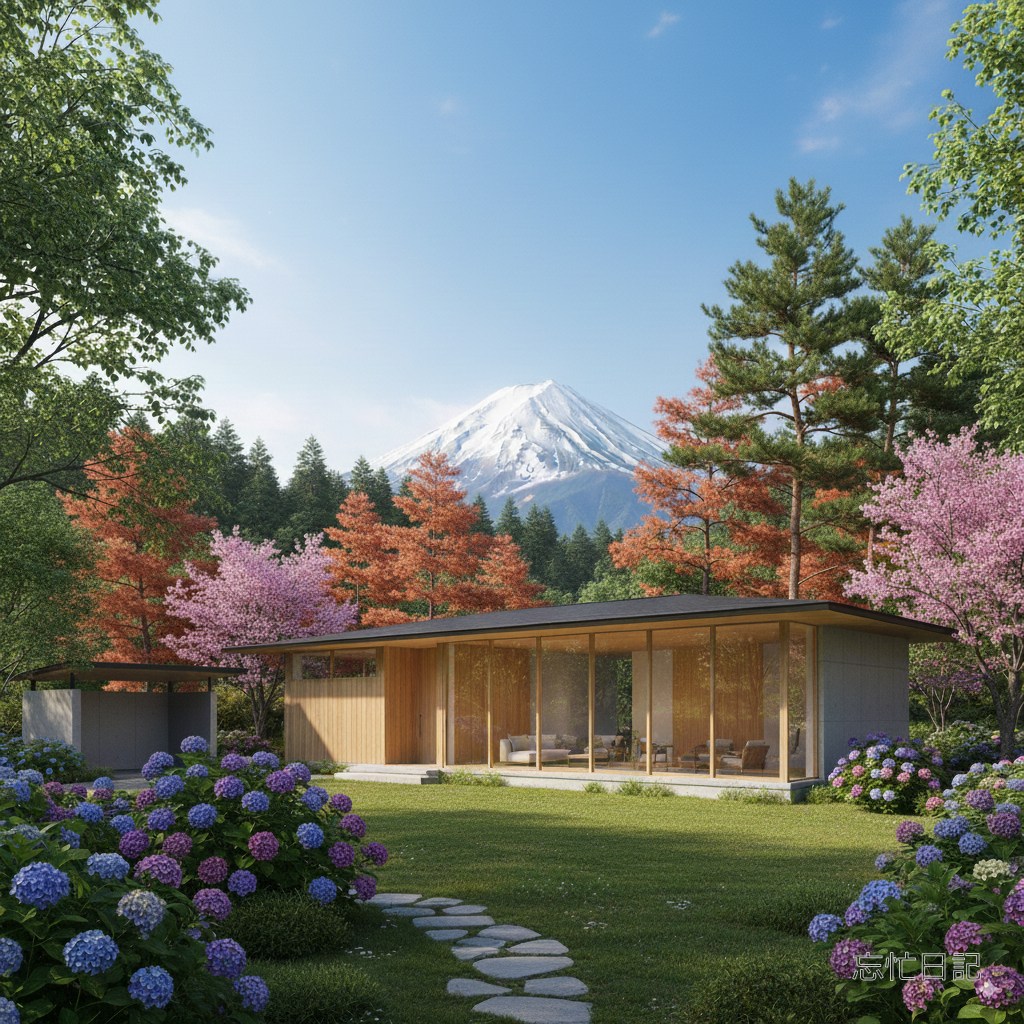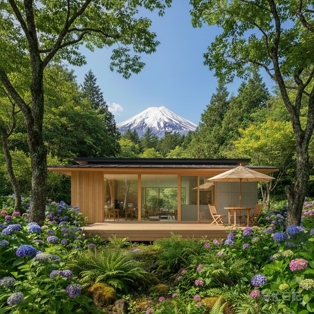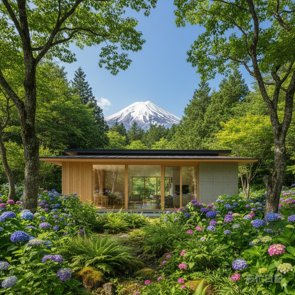 初夏の日本の富士山麓の高原にある、コンパクトでモダンな別荘のリアルなイメージを作成してください |