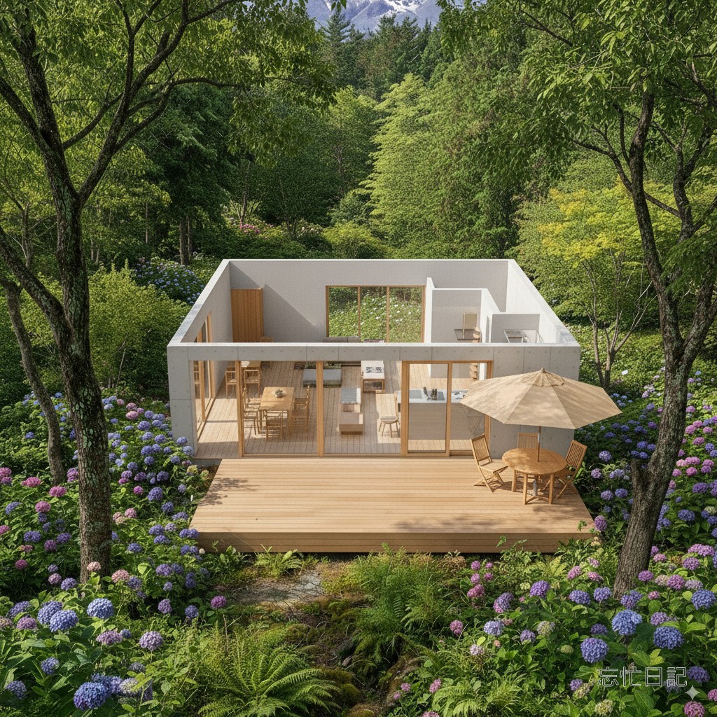 庭にはプールや水盆地は必要ありません。また、駐輪場などの構造物は必要ありません。庭の花は、春の桜と梅雨の季節のアジサイが同時に咲いてしまっているので、アジサイの花を残し、桜の木は新緑にしてください。別荘の周囲には赤松の木を混ぜてください。 |