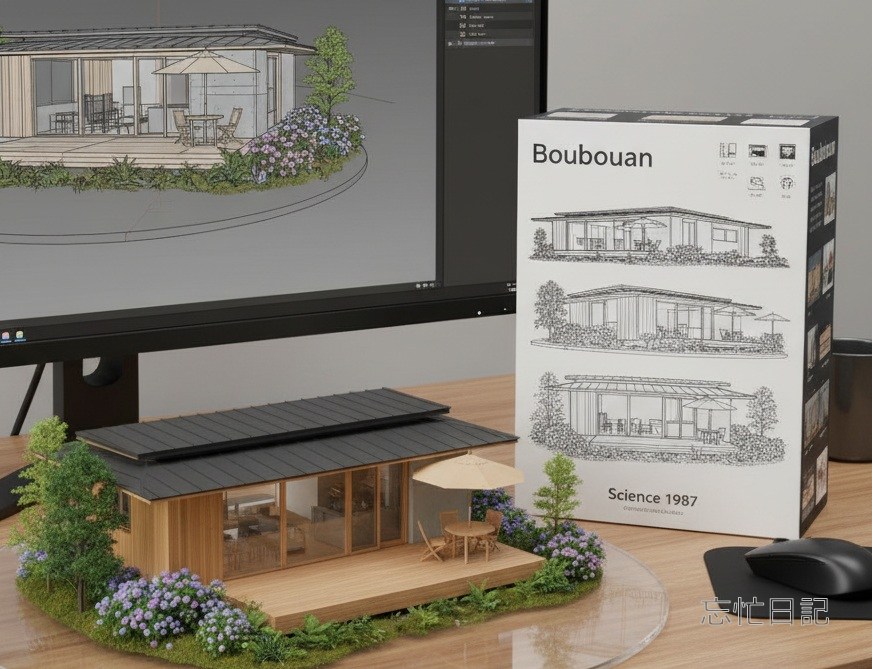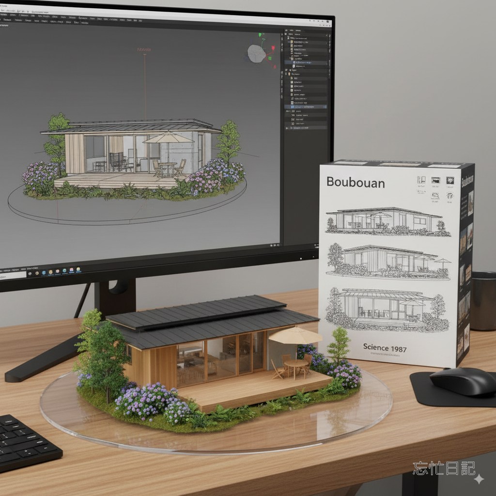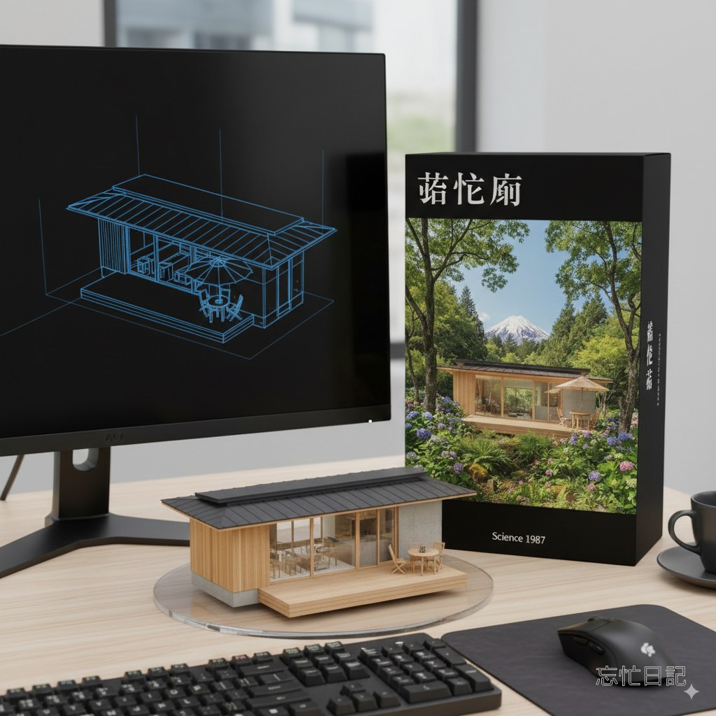写真の別荘を1/100スケールで商品化した模型を、実物の色で、写真の環境下で作ってください。模型はパソコンデスクの上に置いてください。台座は透明なアクリル製の円形で、文字は印刷されていません。パソコン画面には、このフィギュアの3Dモデリング過程を再現したメッシュモデルが表示されています。パソコン画面の横には、高級な模型を彷彿とさせるデザインのパッケージが置かれています。パッケージには、2次元の平面イラストが描かれています。パッケージ前面上部にタイトル「忘忙庵」、下部に「Science 1987」を明記してください。 |