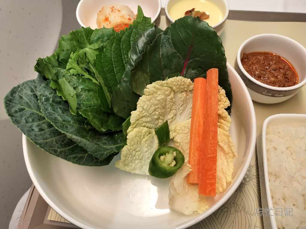 葉物野菜とニンジン、青唐辛子が入っていて、ここにごはんとローストダックをのせ、辛みそを少し載せて包んで食べると、とてもおいしいのは知っていましたが、私はいつもステーキの誘惑に負けてしまいます。