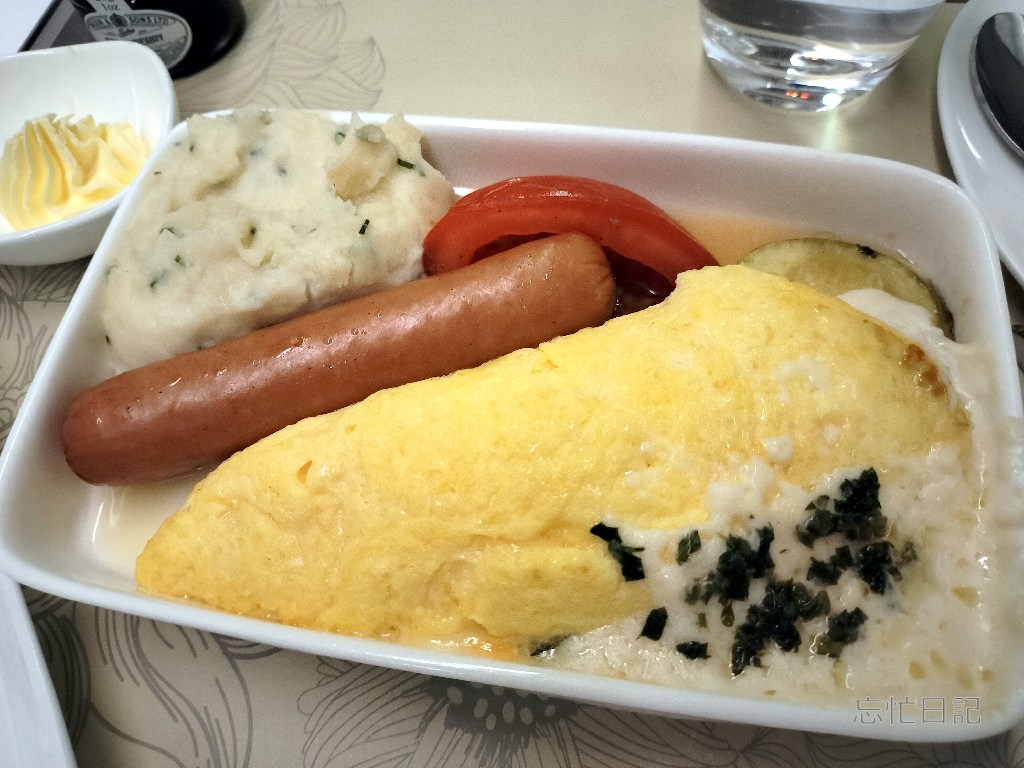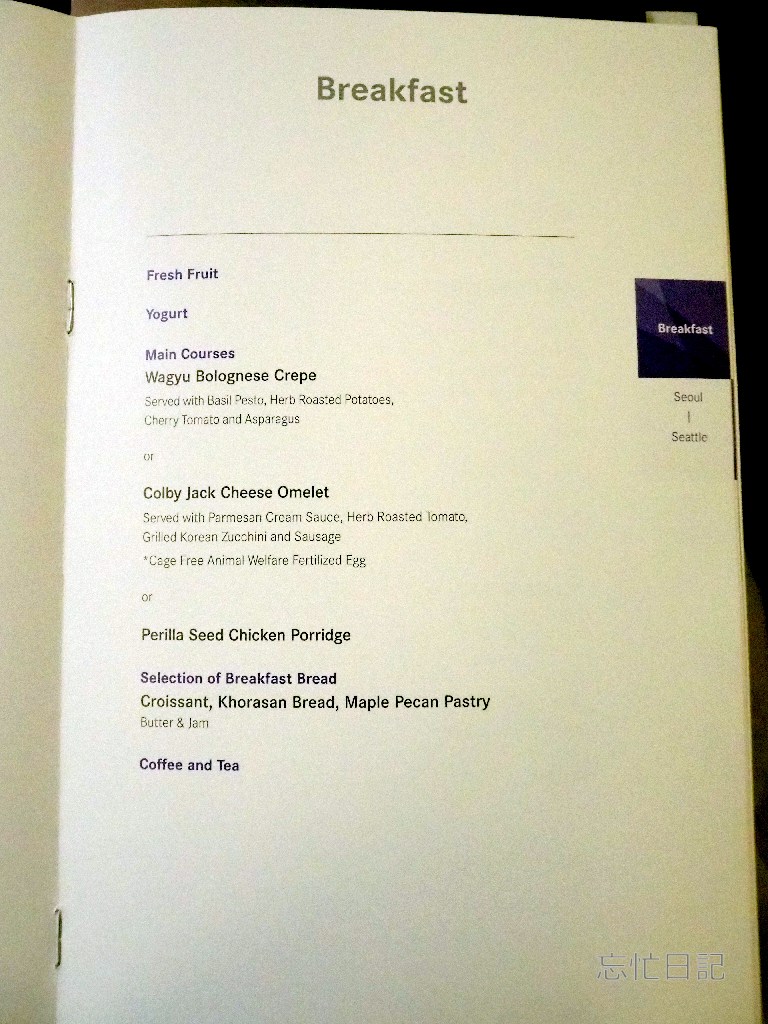 シアトルへの到着は、お昼の12:45ですが2度目の機内食は朝食の扱いでした。内容は、フルーツとヨーグルトに、メインは、和牛ボロネーゼクレープまたはコルビージャック・チーズオムレツ(コルビージャックはチーズの種類)または、ペリラシード・チキン・ポリッジ(エゴマの種入り鶏粥)でした。