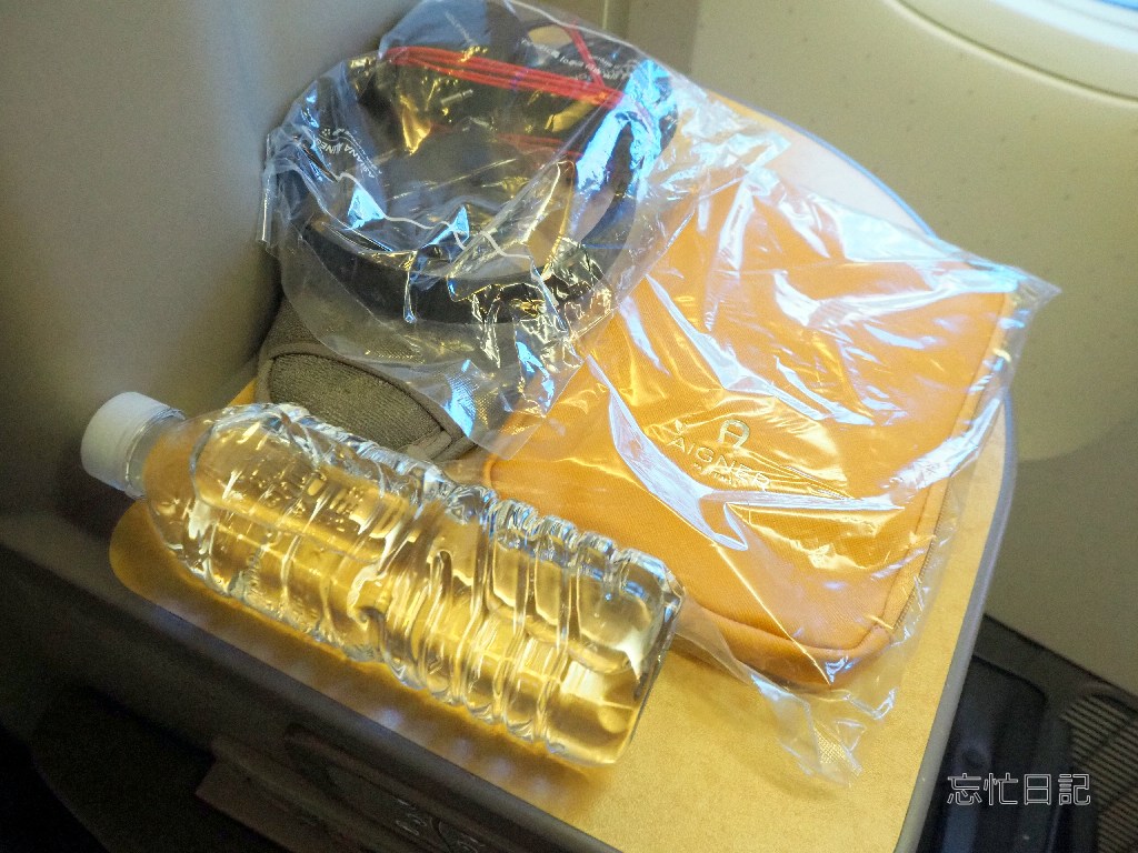 サイドテーブルには、ヘッドホンと水、AIGNERブランドのアメニティーが用意されていました。モニターサイズは15.4インチで、