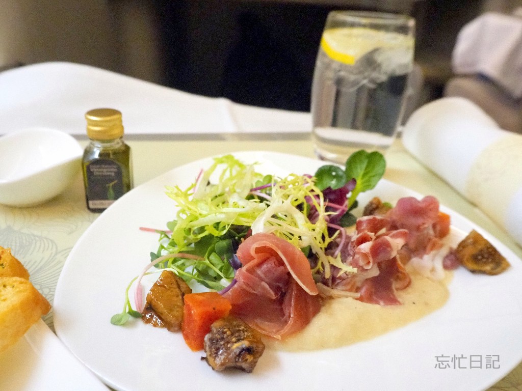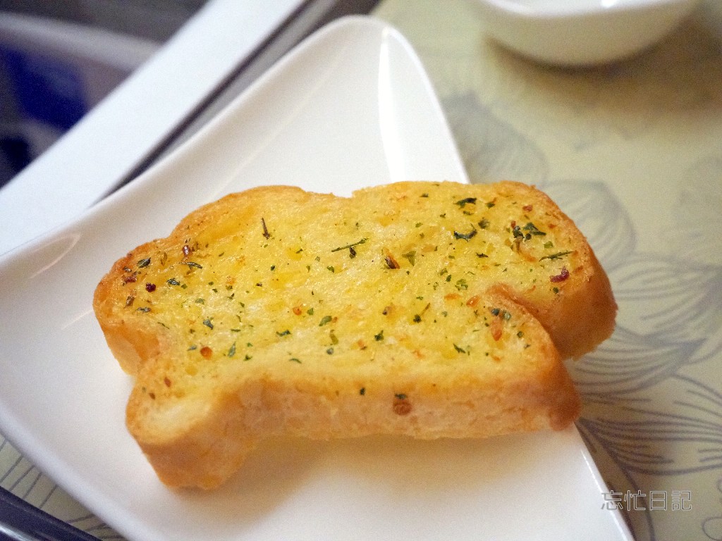 グリーンサラダにイベリコ豚の生ハム、ドライイチジクなどが添えられていました。パンはCAさんがバスケットに入れて持ってきたものの中から選ぶ方式。私はガーリックトーストをいただきました。