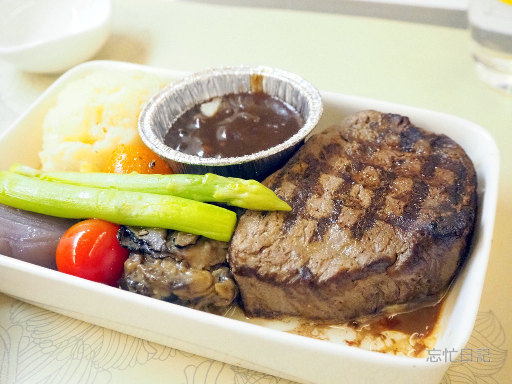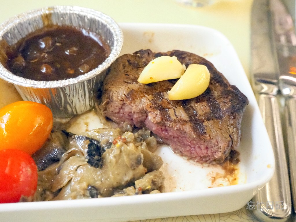 お皿いっぱいの牛ステーキに、マッシュポテトと黒トリュフの香りの効いたソース、ミニトマトとアスパラガスが添えられています。デミグラスソースが別添えになっているのもグッドポイント。私は、牛肉はソースより塩コショウで食べるのが好きなので、この方式がありがたいです。