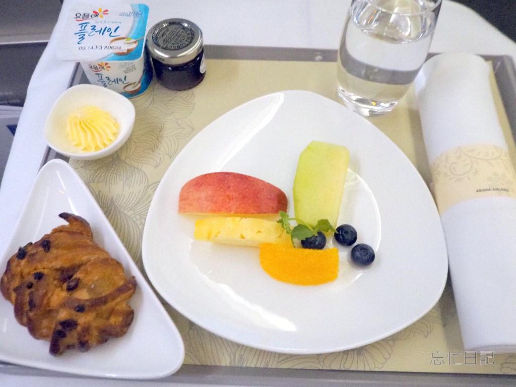 アシアナ航空やシンガポール航空では、到着前の2度目の機内食は、たいてい最初にフルーツが出てきます。海外では普通の感覚なのかもしれません。私的には、フルーツは食後に食べたいなと思うので、そうお願いすればよいのですが、最初に有無を言わせずさっさと配られるので、お皿を置かれてしまうとなかなか「フルーツはあとで」と言い出しにくくなってしまいます。