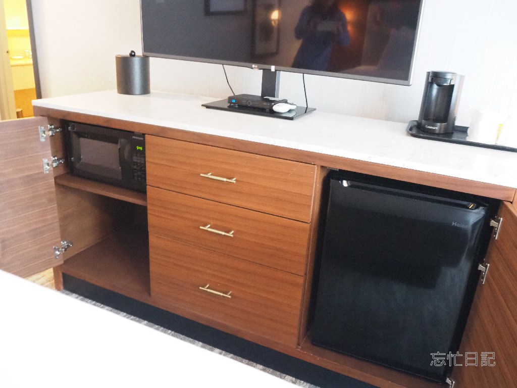 テレビの下には、電子レンジと小型の冷蔵庫がありました。冷蔵庫も、スーパーで買ってきた食材やミルク、フルーツなどを入れるとぎりぎりの容量でした。