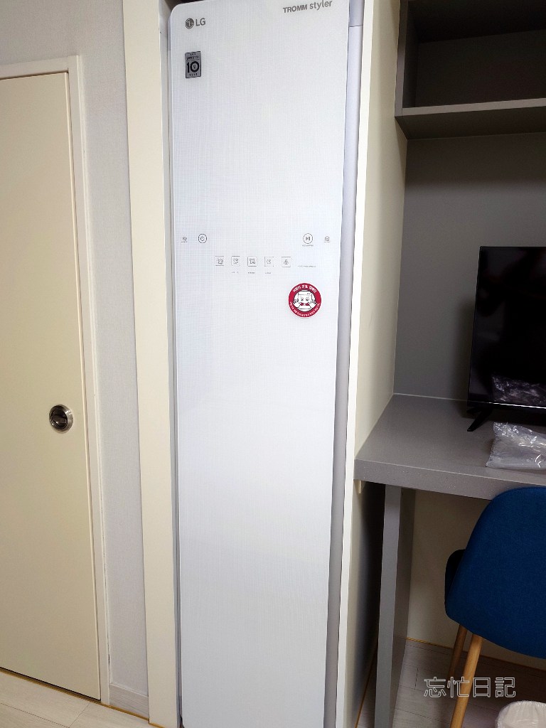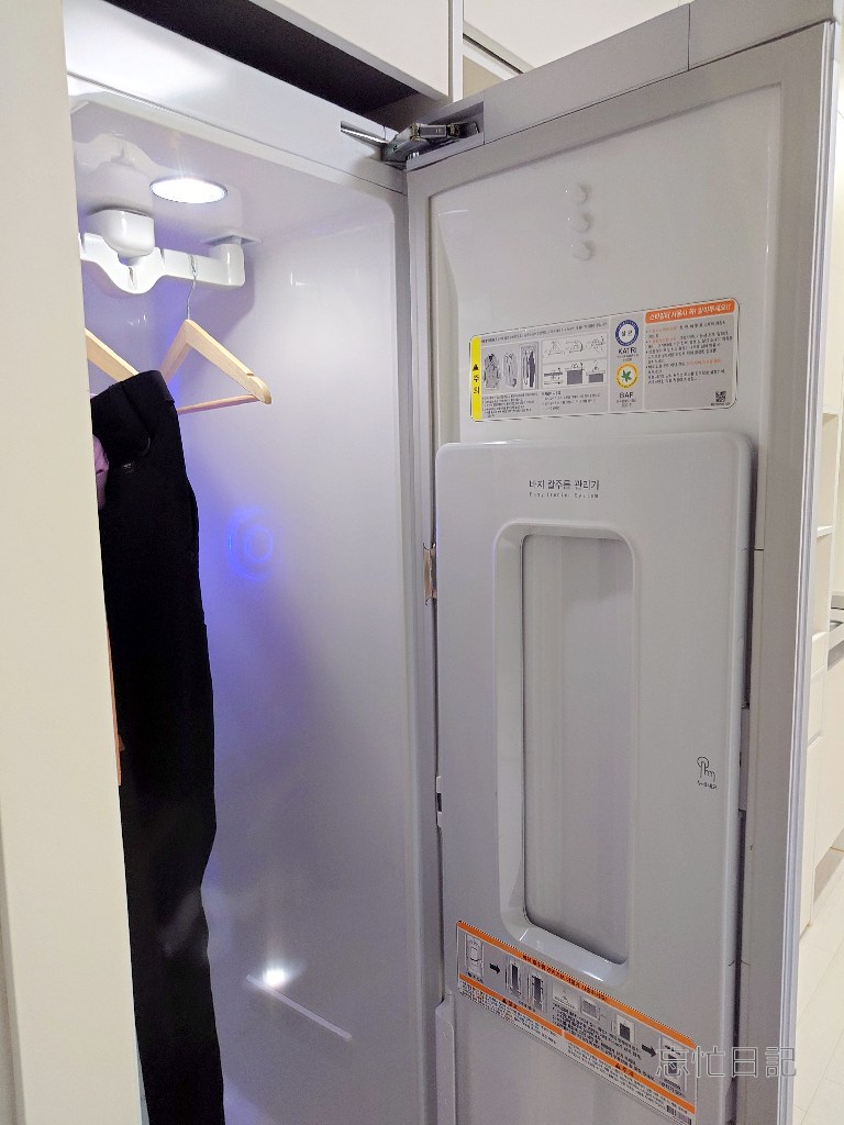 説明を、Google翻訳を使ってみてみると、どうやら、衣類をセットしてスタートすると、振動とイオナイザーで衣類のしわ伸ばしと消臭をしてくれる装置のようでした。しかしながら、表示や説明はすべて韓国語のハングルのみだったので、使い方がさっぱりわからず、ただのクローゼットとしてしか使いませんでした。