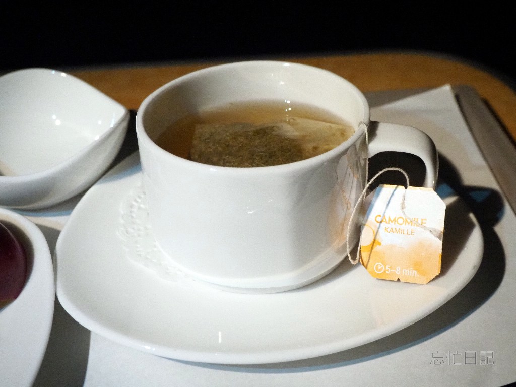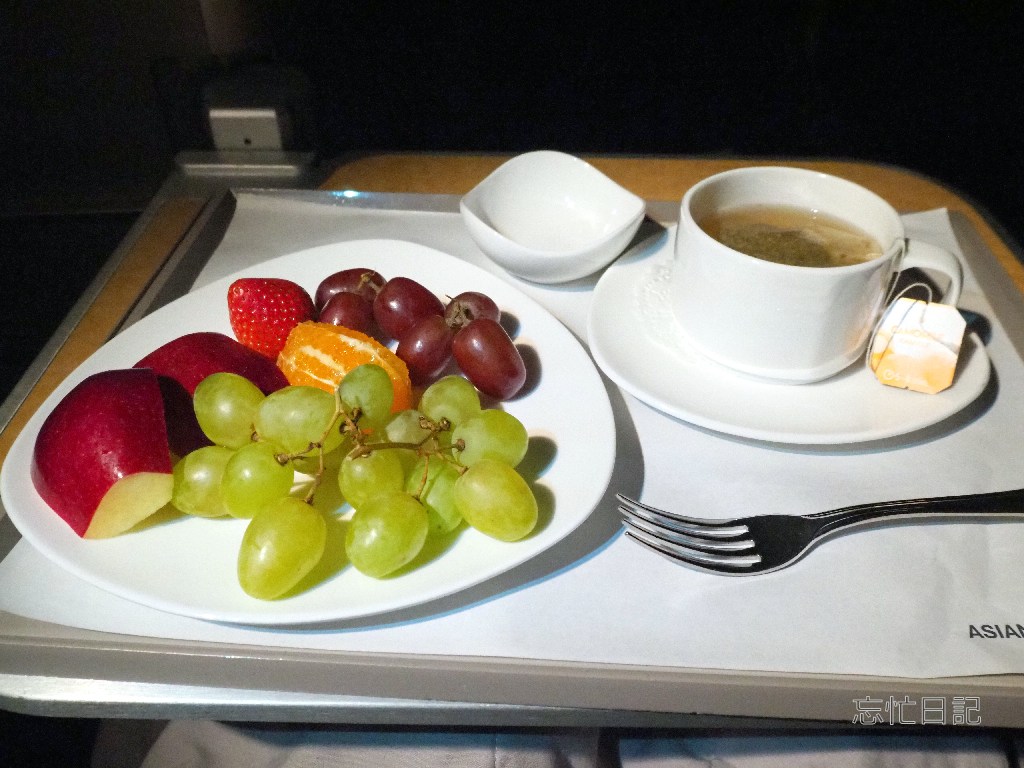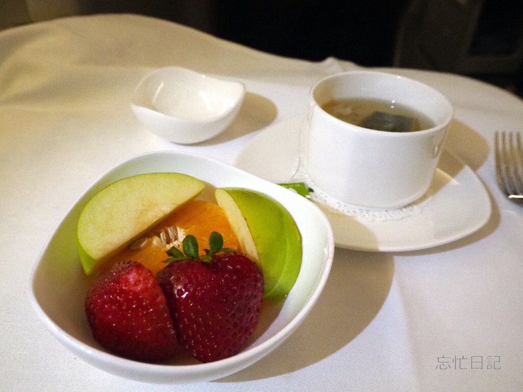 フライトの半ばでフルーツとお茶