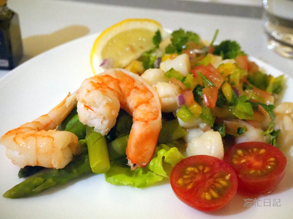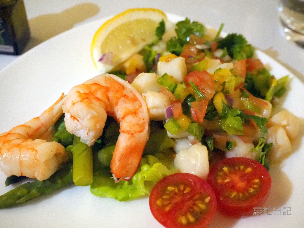 最初にエビとホタテのマリネです、ドリンクはスパークリングウォーターです。