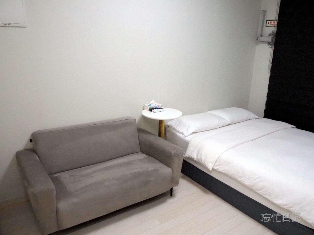 部屋にはダブルベッド1台、2人がけソファー、