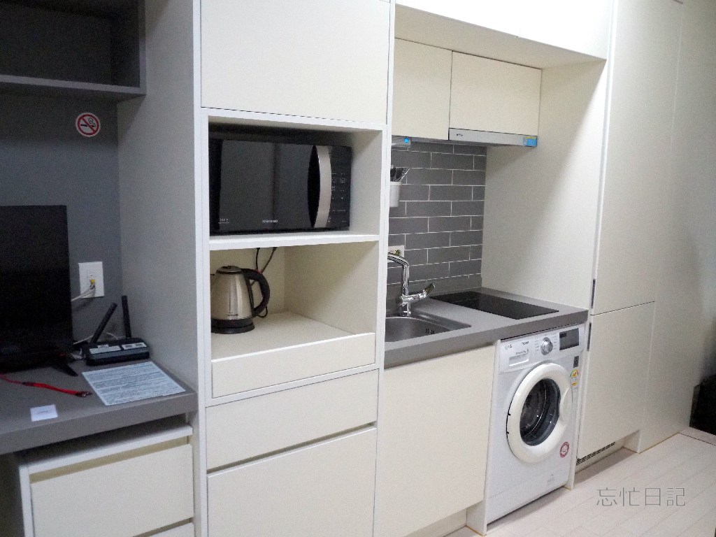 IHコンロと流し、洗濯機と電子レンジ、湯沸かしポットなどがあり、しばらくなら暮らせそうな部屋でした。