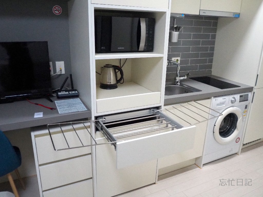 洗濯機で洗濯したものをどこに干すのだろうと思っていると、電気ポットの下の引き出しを開けると、
