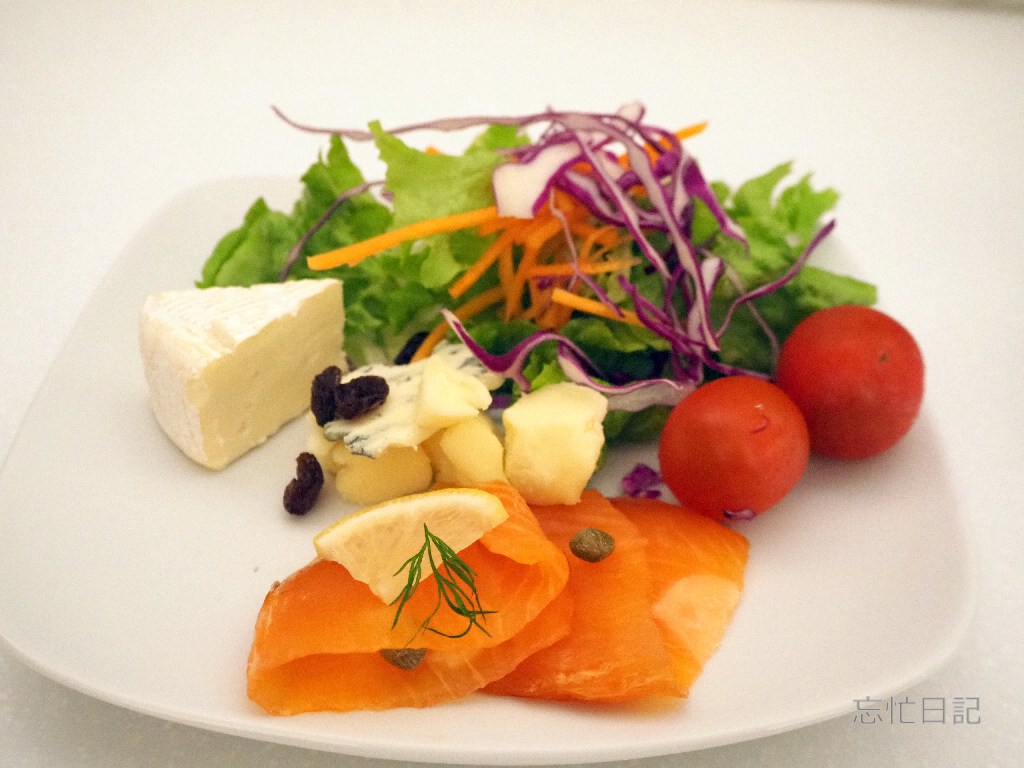 ビュッフェコーナーには、サラダとチーズ、フルーツ、
