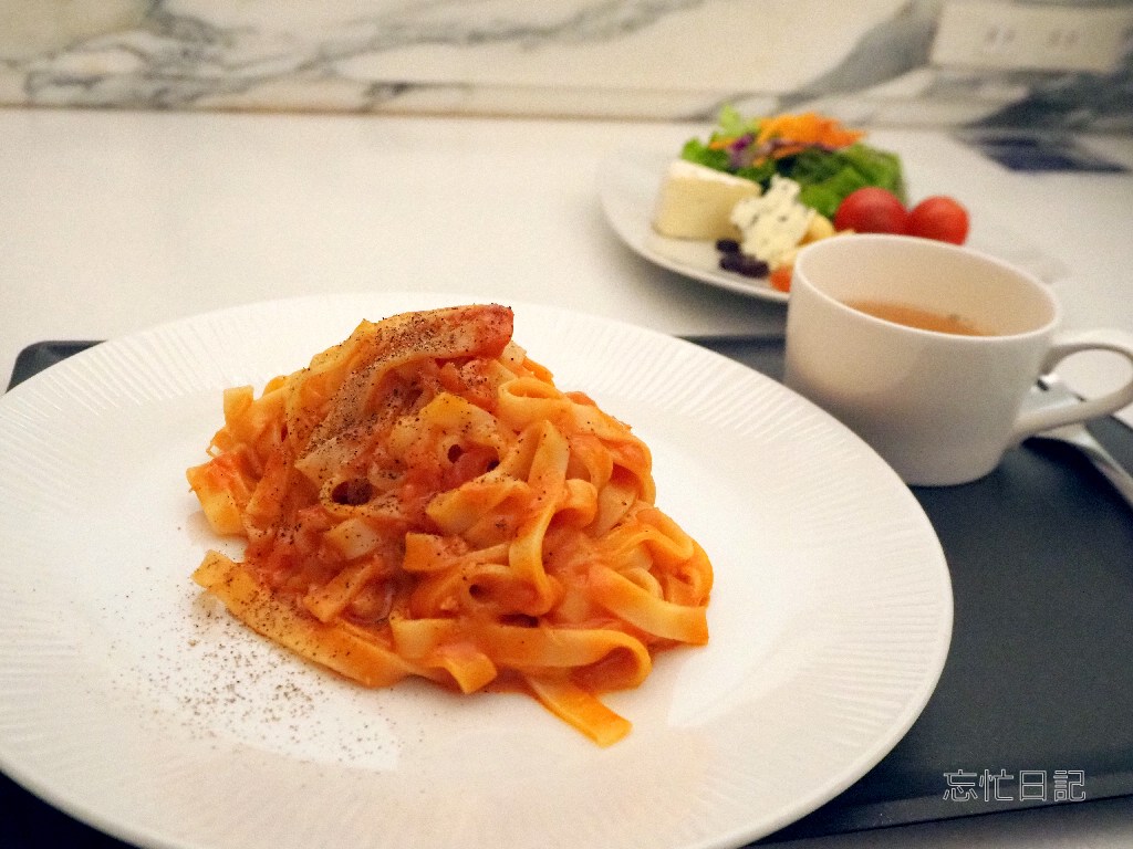 フェットチーネと蟹のトマトクリームソース「SUITE LOUNGE限定」と、ANAオリジナルビーフコンソメスープ「SUITE LOUNGE 限定」いただきました。「限定」に弱いです💦