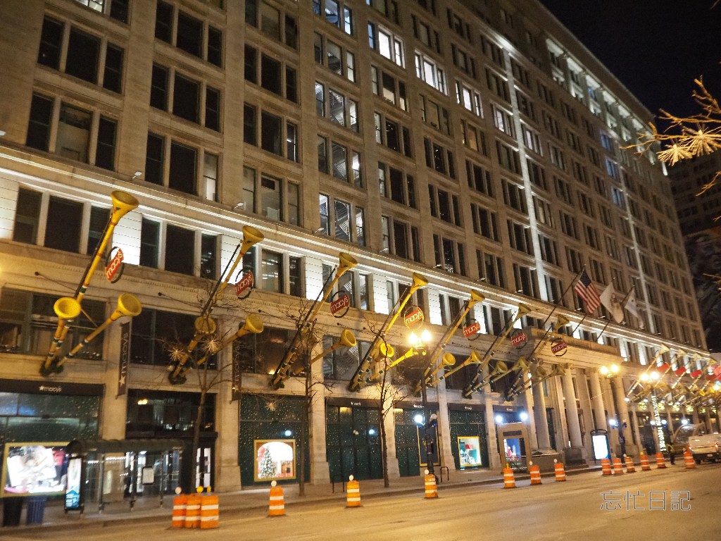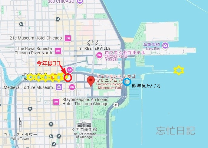 昨年はミシガン湖岸で、Navy Pierから上がる花火を見ましたが、今年は、気温が-10℃と寒かったので、風当たりが厳しい湖岸は避けて、街の中心のシカゴ川に上がる花火が見渡せる、赤丸印付近から鑑賞することにしました。